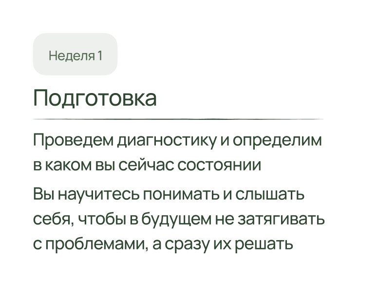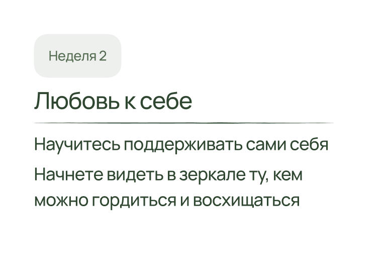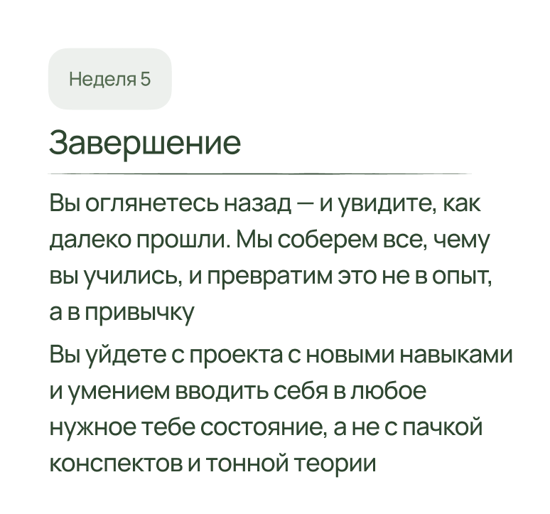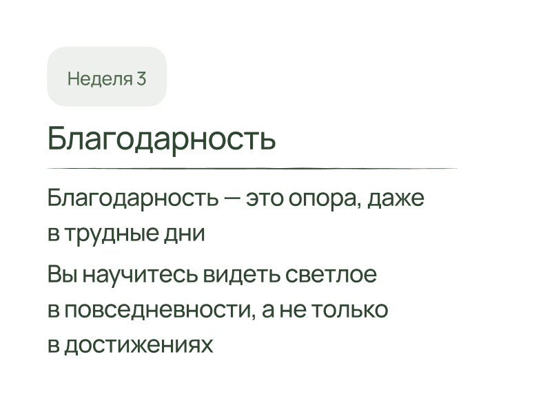 Ровно для этого мы и создали проект. Чтобы вы за 20−40 минут 2 раза в неделю перестали суетиться и научились успевать гораздо больше во всех остальных сферах жизни. Станете и счастливее, и богаче, и увереннее в себе с помощью простых практик. И даже, если пропадаете на пару дней — не страшно, мы вас подождем